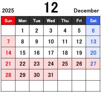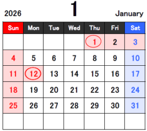 *12/22から1/4までは冬休みです。1/12は祝日のためお休みです