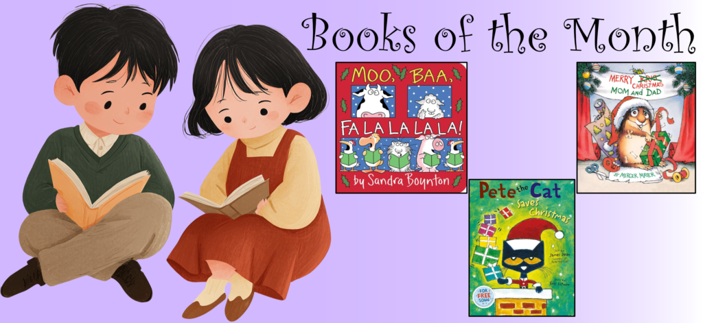 *12月は幼稚園クラスで、クリスマスの絵本を3冊読みます。サンドラ・ボイントン作の「MOO, BAA, FA LA LA LA LA」、エリック・リトウィン作の「Pete the Cat Saves Christmas」、マーサー・メイヤー作の「Merry Christmas Mom and Dad」です。レッスンから帰ってきたら、ぜひお子さんに本のお話を聞いてみてくださいね。