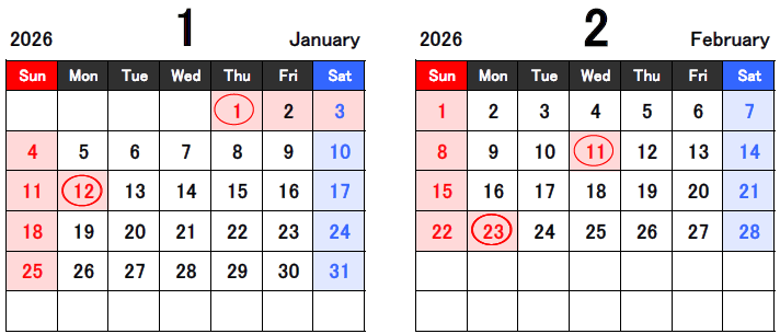 ※1/1~1/4は冬休みです。また、1/12, 2/11, 2/23は祝日のためお休みです