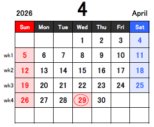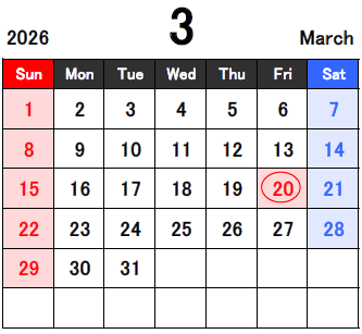 ※3/20, 4/29は祝日のためお休みです